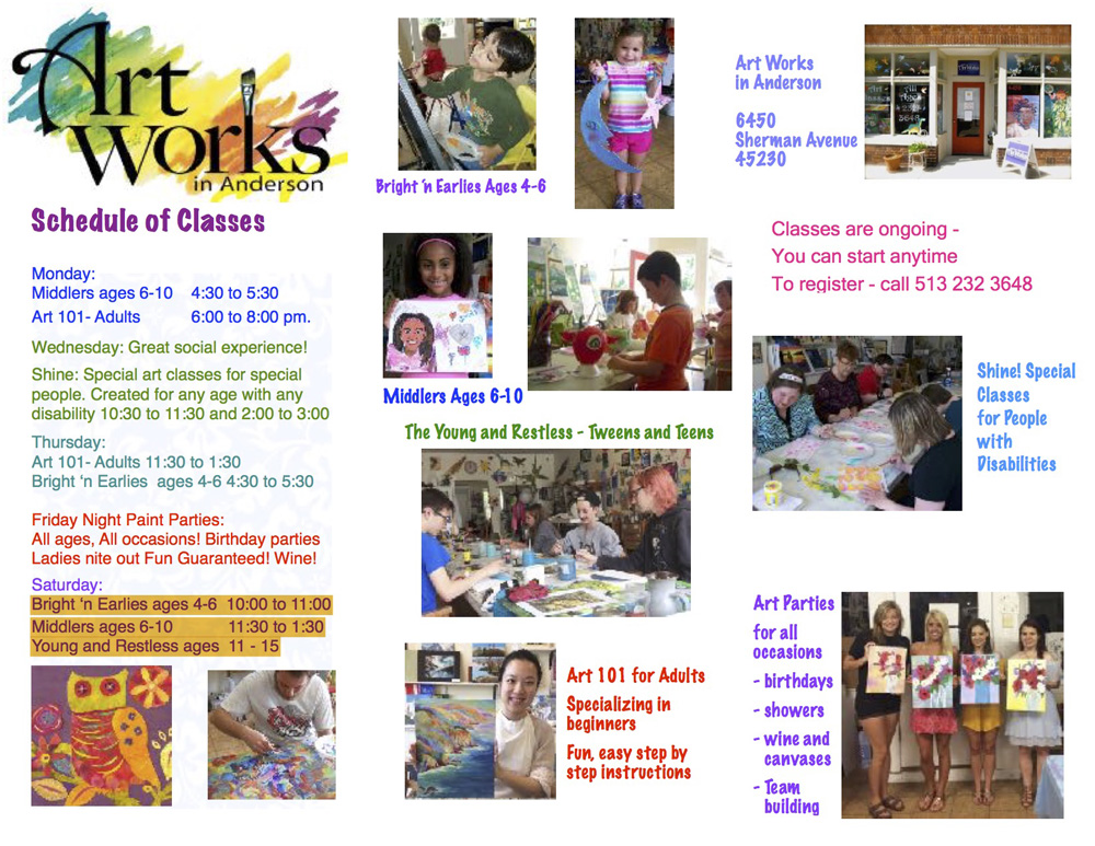 The schedule of Cincinnati art classes at Mt. Washington Artworks in Anderson township for 2019. We offer art classes for kids in Cincinnati, Ohio -- real art lessons taught by experienced teachers and professional artists. Our unique method of instruction and individual attention has produces a very successful art course and a very enjoyable time as well. If you miss a week of art classes for any reason, we let you make it up. All art supplies and materials are included in the tuition, so you never have to buy anything. These classes are not just for the gifted and talented, but for anyone who enjoys making and exploring art. Your first class is always free. The art classes for kids offers safe mediums and fun projects, including story-telling and innovative art materials not normally found in a school environment. In addition to art classes for kids in Cincinnati, we offer a unique and fun opportunity for the beginner or the experienced artist to paint in a beautiful studio with water colors, acrylics, and pastels. Ongoing registration for art classes in Cincinnati! You can start anytime! And if you miss a week of art classes you can always make it up! | |||||||